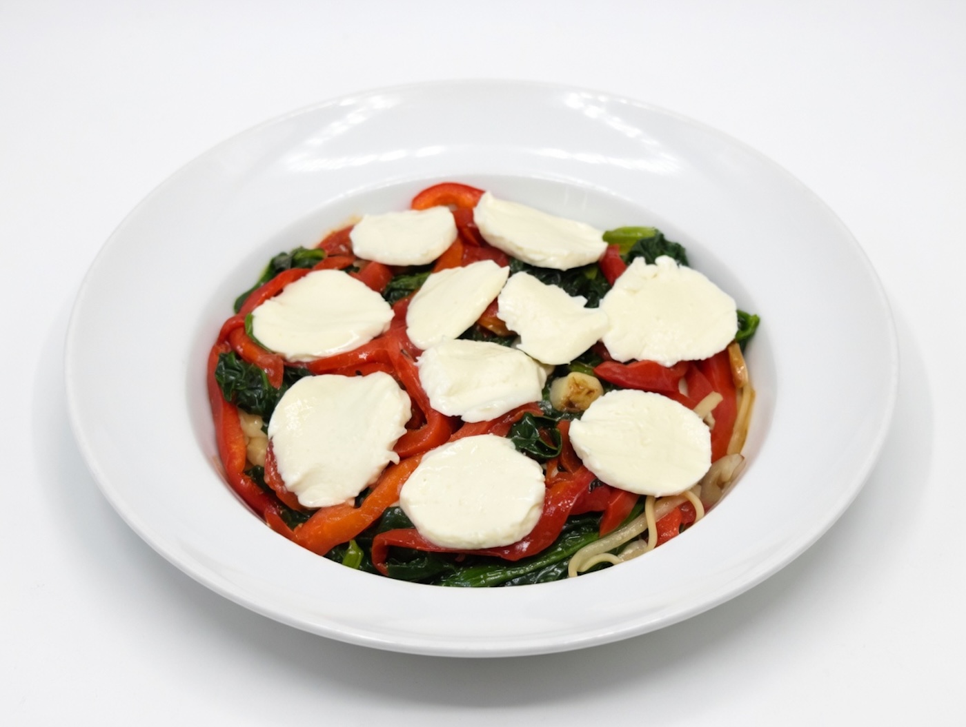 Roasted peppers and fresh mozzarella over spinach in a white wine sauce